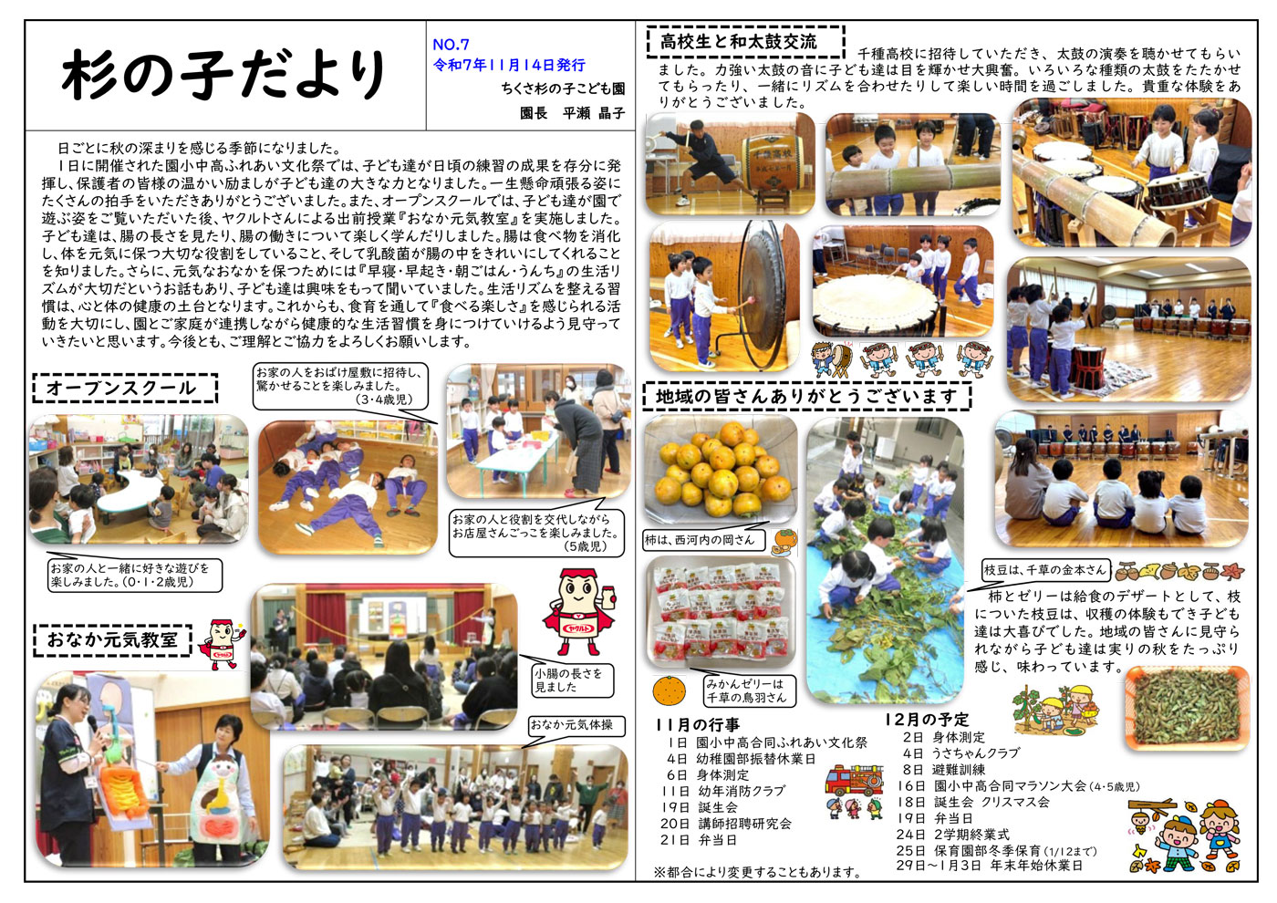 杉の子だより 令和7年11月号 2025/11/14 ブログ, 杉の子だより ちくさ杉の子こども園 杉の子だより 11月号 日ごとに秋の深まりを感じる季節になりました。1日に開催された園小中高ふれあい文化祭では、子ども達が日頃の練習の成果を存分に発揮し、保護者の皆様の温かい励ましが子ども達の大きな力となりました。一生懸命頑張る姿にたくさんの拍手をいただきありがとうございました。 ちくさ杉の子こども園◆教育・保育の目標◆○こんな子に・いのちを大切にする子・自分も友達も大切にできる思いやりのある心豊かな子・食べ物に感謝し、おいしく食べる子。...