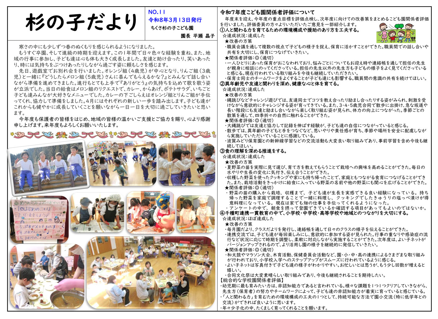 杉の子だより 令和8年3月号 2026/3/13 ブログ, 杉の子だより ちくさ杉の子こども園 杉の子だより 3月号 寒さの中にも少しずつ春のぬくもりを感じられるようになりました。 もうすぐ卒園、そして進級の時期を迎えます。この1年間で日々色々な経験を重ね、また、地域の行事に参加し、子ども達は心も体も大きく成長しました。友達と助け合ったり、笑いあったり、時には気持ちをぶつけあったりしながら過ごす姿に頼もしさを感じます。 ちくさ杉の子こども園◆教育・保育の目標◆○こんな子に・いのちを大切にする子・自分も友達も大切にできる思いやりのある心豊かな子・食べ物に感謝し、おいしく食べる子。...