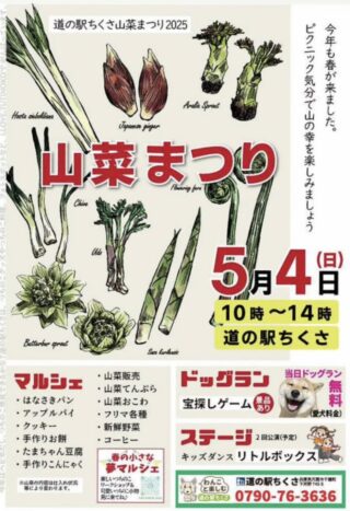 道の駅ちくさ「山菜まつり2025」 2025/4/17 イベント, ブログ ~今年も春が来ました ピクニック気分で山の幸を楽しみましょう~ 山菜まつりが、5月4日(日)に道の駅ちくさで開催されます☆ ドッグランにステージイベント、マルシェも盛りだくさんです!! ゴールデンウィークの一日、ぜひ、道の駅ちくさへお越しください♪
