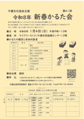新春かるた大会 2025/12/18 イベント, ブログ 千種文化協会主催、【第41回 令和8年 新春かるた大会】のお知らせです☆ 日時:令和8年1月4日(日)午前9時~12時 場所:ライブリーちくさ 2階 かるたの種目:いろはかるた・ふるさとかるた・百人一首(詳細はチラシでご確認ください) 参加費:無料 申し込み:12月24日(水)までに、申し込みフォームか千種文化協会事務局(千種生涯学習事務所)まで。