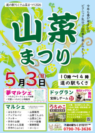 山菜まつり2026 2026/4/21 イベント, ブログ 道の駅ちくさ【山菜まつり2026】のお知らせです。 とき:5月3日(日)10時~14時 ところ:道の駅ちくさ(千種町下河野) 「夢マルシェ」や「ドッグラン」、美味しそうなマルシェが盛りだくさんです。 ぜひ、ピクニック気分で山の幸を楽しみに来てください♪